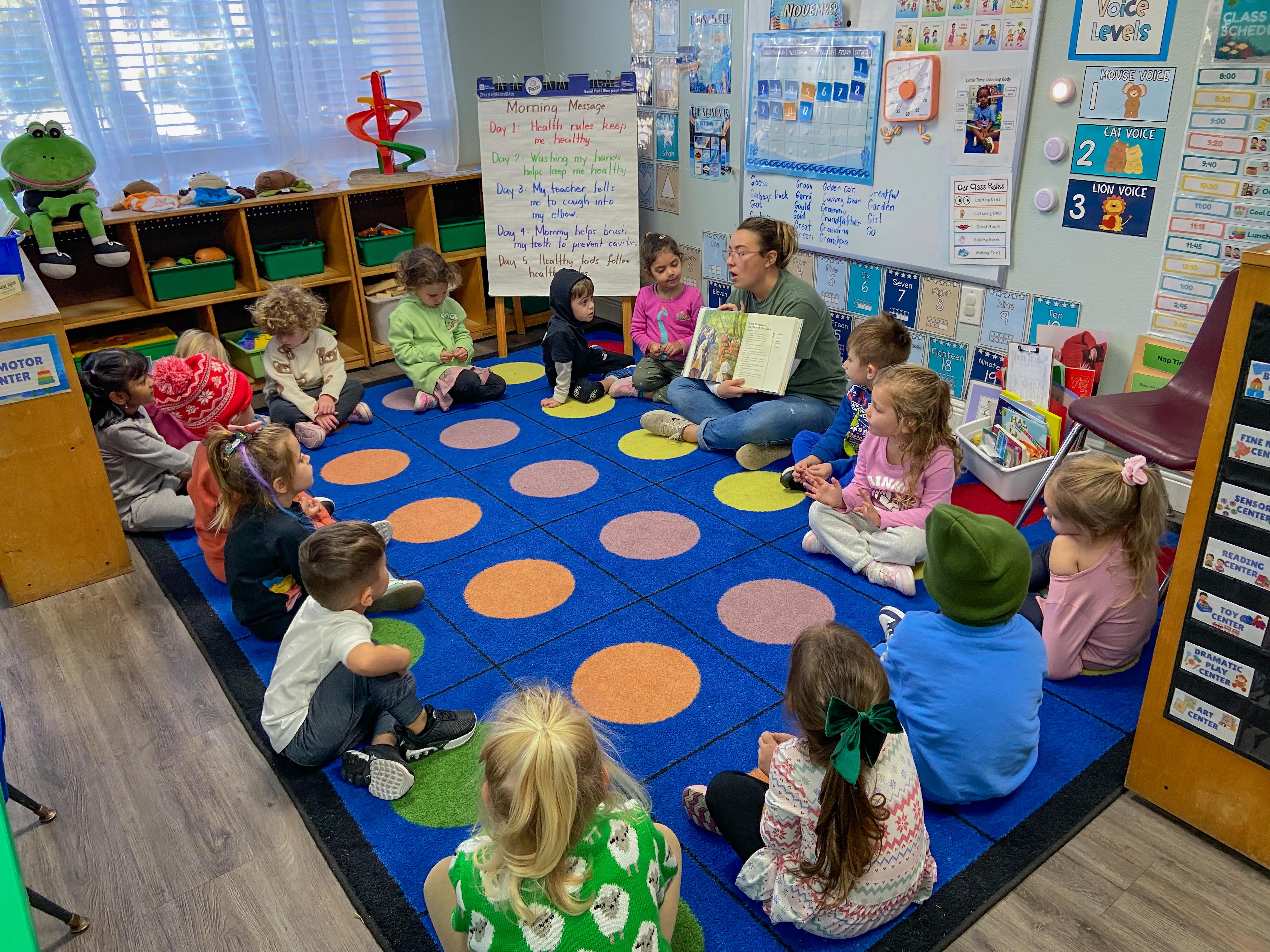 Our classrooms are designed to help children explore through centers, circle time, interactive play, music, outdoor time, and hands-on experiences.